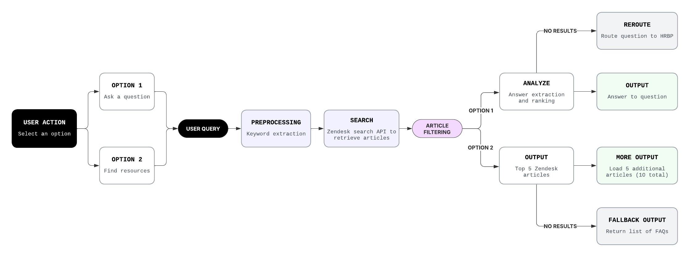 Since Zendesk’s Search API already applies AI to return the most relevant results, I simply cleaned up query inputs to enhance accuracy. The chatbot then returned the top 5 articles, ensuring users had quick access to the best available resources.